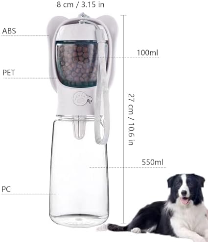 【UPGRADED BIGGER CAPACITY】- The water bottle can hold max 19 ounces (550ml) of water and 100 g food. It not only ensures dog drinking water easily but also cat, rabbit or other small pet to drinking water easily. You can put this bottle into your pocket, backpack or hanging on your hand with sling rope.